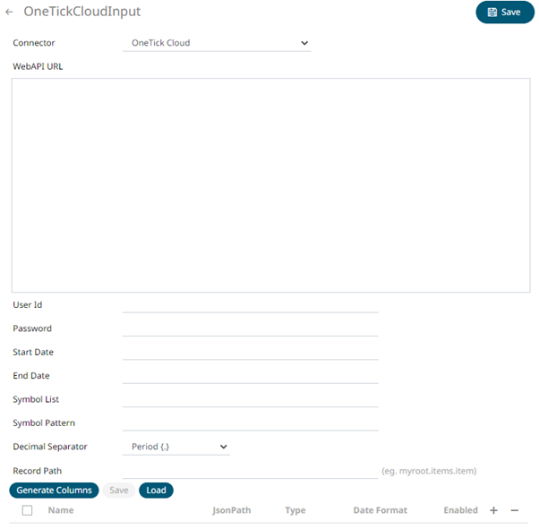 1. In the New Data Source page, select Input > OneTick Cloud in the Connector drop-down list.