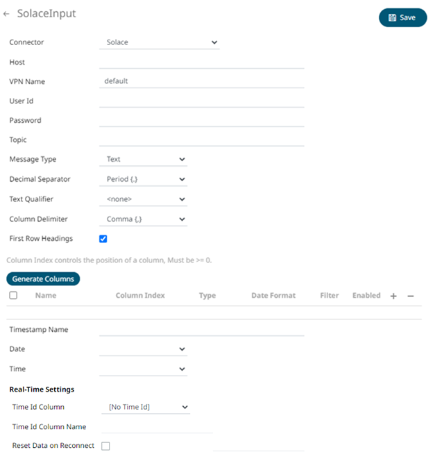 1.     In the New Data Source page, select Input > Solace in the Connector drop-down list.