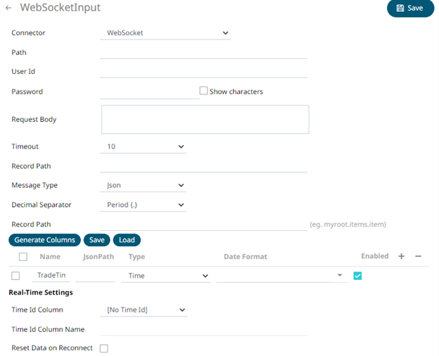 1. In the New Data Source page, select Input > WebSocket in the Connector drop-down list.