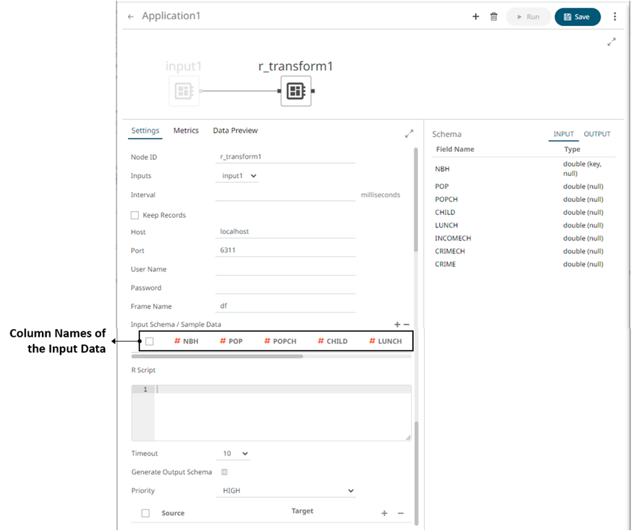 3. On the Input Schema/Sample Data section, the column names of the Input data source are displayed. You can opt to add sample data to ensure transform is applied in case the input database, files, or infrastructure becomes unavailable.