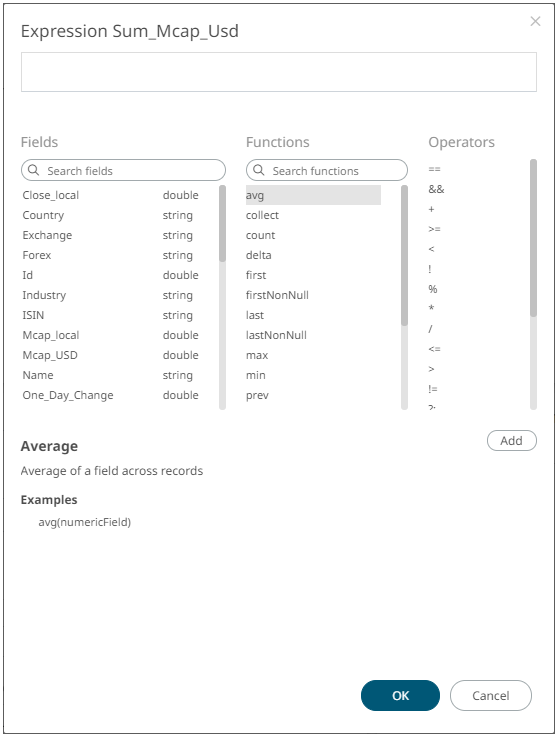 Create new fields using data from existing columns in your input operator and supported aggregation or calculation functions and operators.