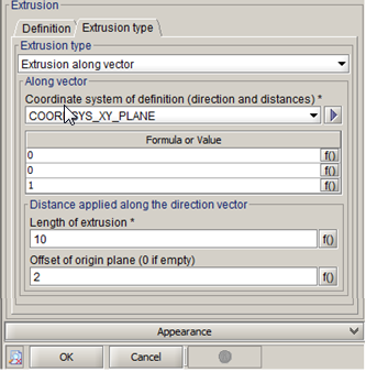 - The coordinate system of definition of direction and distances to apply to the extrusion (coordinate system of the sketch by default)