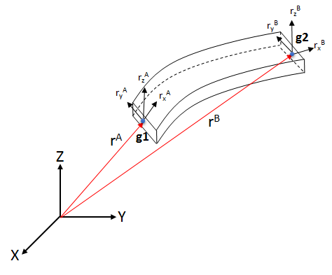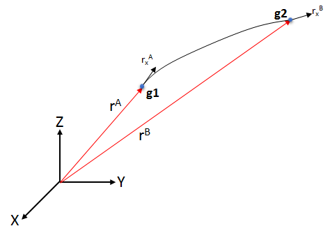 The second type of LINE element supported in MotionSolve is the CABLE element. Such a CABLE element can be considered a LINE element in that it is defined by two nodes - one at the start (g1) and one at the end (g2) of the element. This is illustrated in Figure 3.