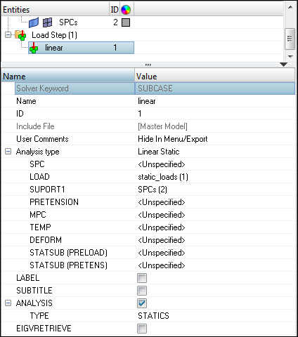 An OptiStruct subcase has been created which references the forces in the load collector static_loads and the inertia relief support points in the load collector SPCs.