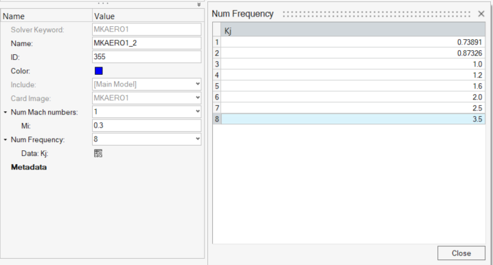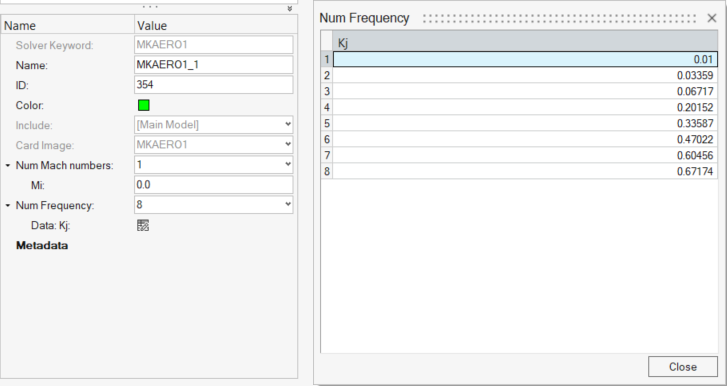 In this step, the MKAERO1 entry is used to define the Mach number and reduced frequency table. Two MKAERO1 entries are created, since each MKAERO1 entry only allows a maximum of 8 fields.