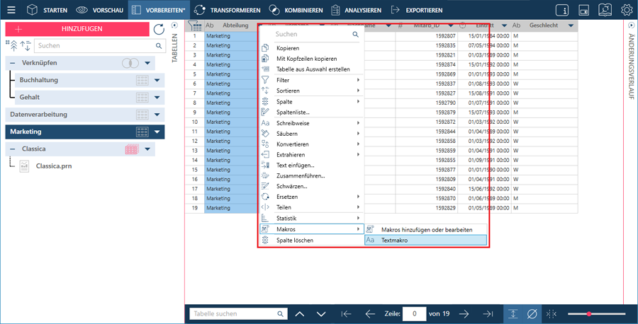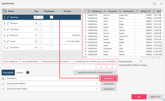 Makros lassen sich leicht über das Kontextmenü oder das Dialogfeld „Spaltenliste“ auf Spalten in einer Tabelle anwenden.