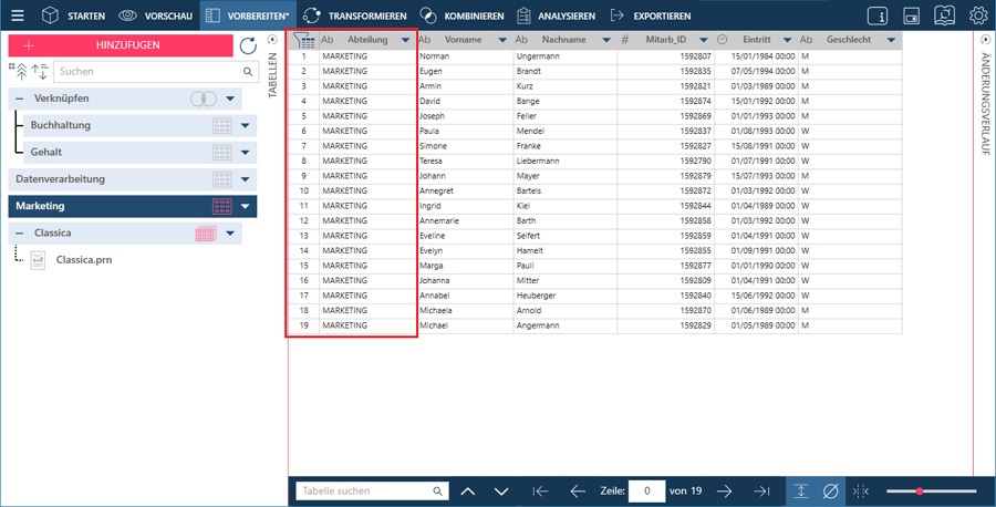 Wählen Sie eine Spalte in der Tabelle aus, auf die ein geeignetes Makro (z. B. ein numerisches Makro für ein numerisches Feld) angewendet werden soll, und klicken Sie dann auf die Schaltfläche Anwenden rechts neben dem anzuwendenden Makrotyp. Das Makro wird auf alle Spalten angewendet, die denselben Datentyp haben wie die von Ihnen ausgewählte Spalte, und die Datenvorschau zeigt die Ergebnisse Ihres Makros an.