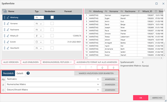 Makros können auch über das Dialogfeld „Spaltenliste“ angewendet werden. Zeigen Sie das Dialogfeld „Spaltenliste“ aus einer beliebigen Spalte in der Tabelle an. Die verfügbaren Makros, sowohl die privaten als auch die geteilten, werden unten im Dialogfeld angezeigt.