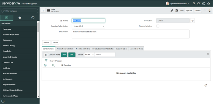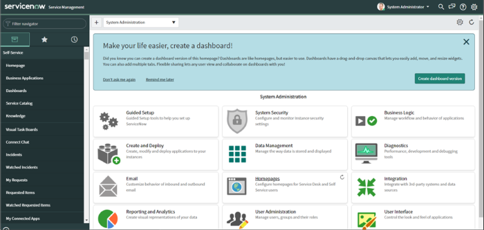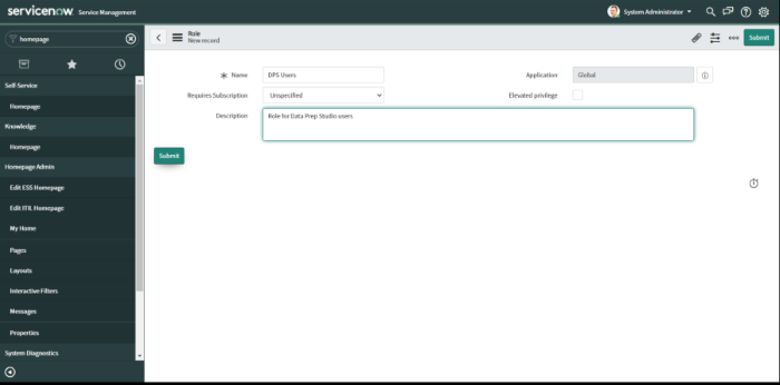 Definieren Sie eine neue Rolle, navigieren Sie zurück zur Homepage, indem Sie auf die Verknüpfung Homepage unter dem Selbstbedienungsabschnitt links der Menüliste klicken, oder verwenden Sie den Filter-Navigator und geben Sie Folgendes ein: „homepage“.