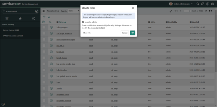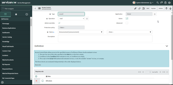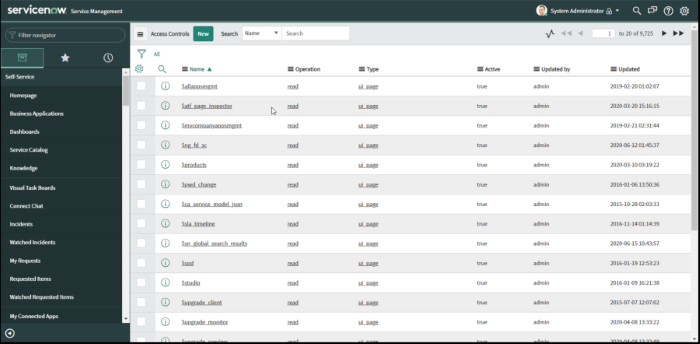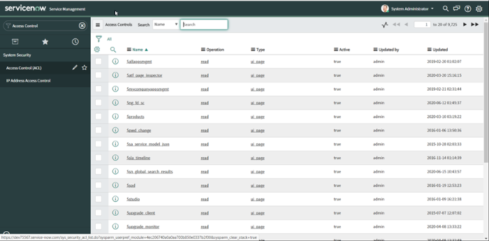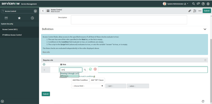 Gewähren Sie Zugriff auf die Tabelle sys_db_object. Geben Sie dazu „Access Steuerelement“ im Filter-Navigator ein: