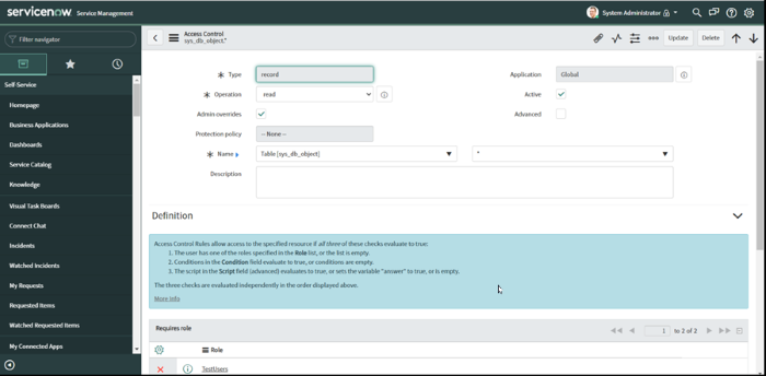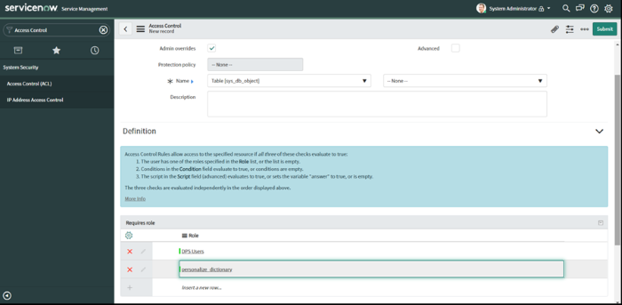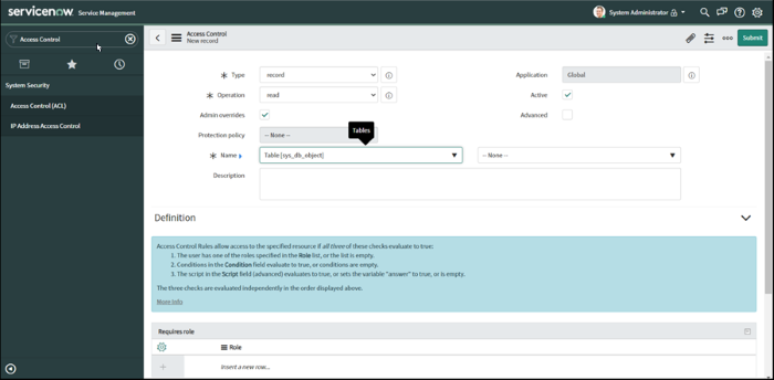 Fügen Sie eine neue ACL hinzu, um auf die Tabelle sys_db_object zugreifen zu können, und zwar mit folgenden Einstellungen: