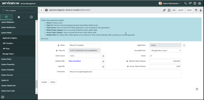 Sobald Sie Ihre Anwendung registriert haben, können Sie die Werte für Client-ID und Clientschlüssel im Dialogfeld ServiceNow Connector verwenden: