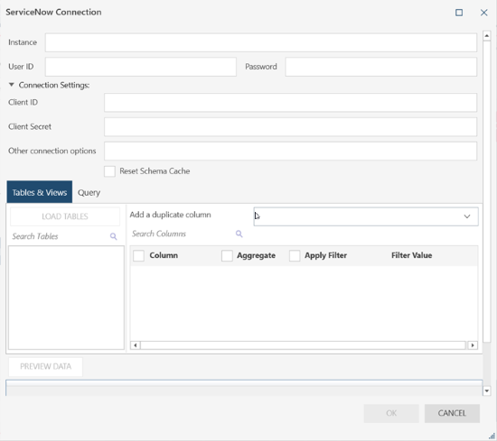 Beachten Sie, dass die Angabe einer Client-ID oder eines Clientschlüssels bedeutet, dass Sie eine Verbindung mit OAuth herstellen möchten und die Felder „Benutzer-ID“ und „Kennwort“ deaktiviert werden, da diese nur für die grundlegende Authentifizierung verwendet werden.