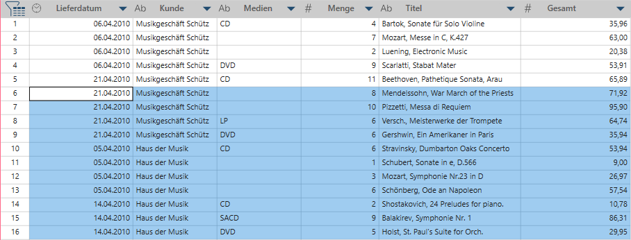 Die Option Tabelle aus Auswahl erstellen erstellt eine neue Tabelle mit folgenden Spalten und Zeilen: