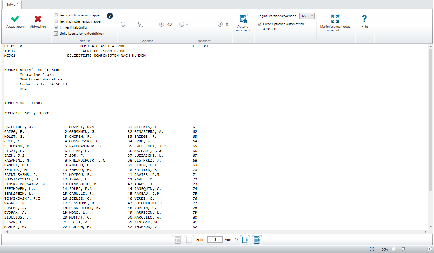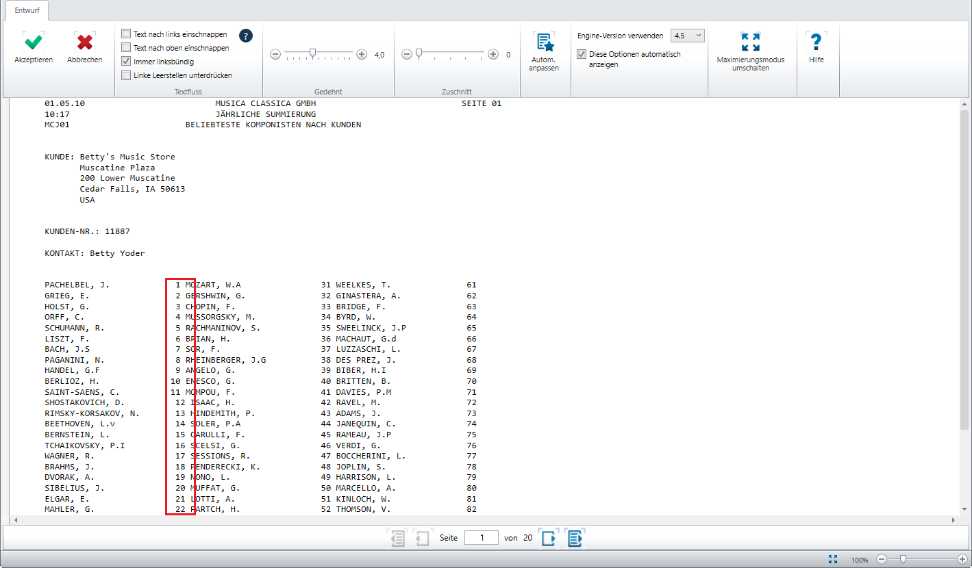 Wie in der Abbildung unten dargestellt, erscheinen die Einträge in der zweiten Spalte des Berichts im Fenster „Berichtsentwurf“ versetzt, falls eine PDF-Engine mit niedrigerer Versionsnummer (z. B. 4.2) als der Standardversion (4.5) verwendet wird.
