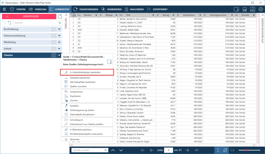 Wenn Sie ein Muster akzeptieren, werden die Daten aus der Kalkulationstabelle extrahiert und im Fenster Vorbereiten angezeigt: