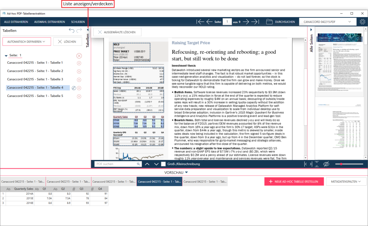 Die Seiten-/Tabellenliste kann mit Hilfe der Verdecken/Anzeigen-Schaltflächen oben auf der Seiten-/Tabellenliste angezeigt oder verdeckt werden.