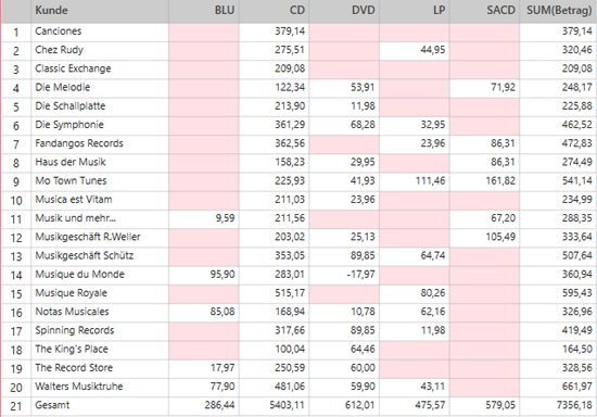 Abbildung 6. Zweidimensionale Summierung mit nach Kunden und Medientypen unterteilten Umsätzen.