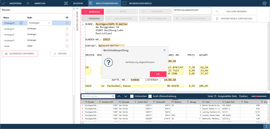 Im Fenster „Berichtsüberprüfung“ wird der Status des Prüfvorgangs angezeigt. Wenn durch den Prüfvorgang ein Feldbegrenzungsfehler festgestellt wird, ermöglicht Ihnen das Fenster „Berichtsüberprüfung“ den Fehler zu berichtigen und den Prüfvorgang fortzusetzen.