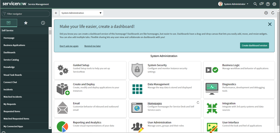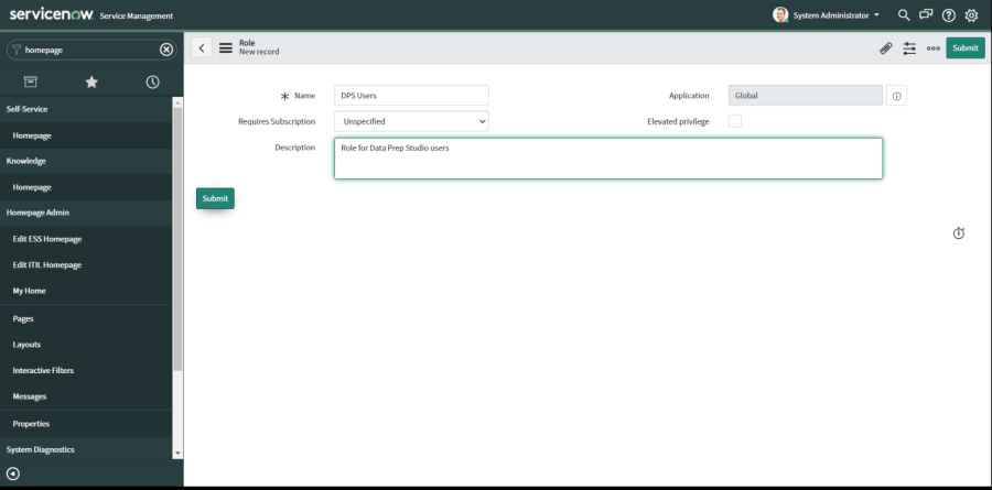 Define a new role, go back to the homepage by clicking on the Homepage link under the Self-Service section on the left side of the menu list, or use the filter navigator and type: "homepage".