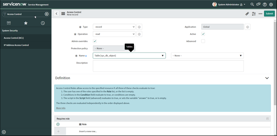 Grant access to the sys_db_object table. Do this by typing Access Control on the filter navigator: