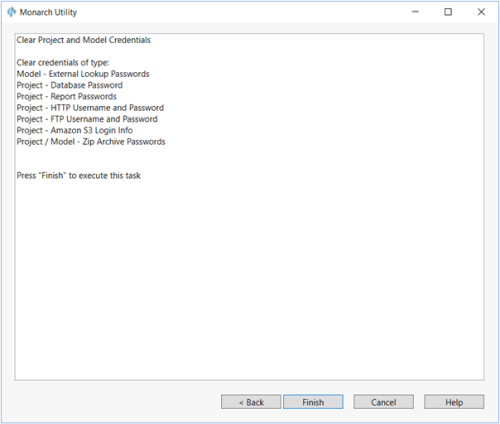 Launch the Monarch Utility wizard and ensure that the button for Clear Credentials from Projects and Models is selected. Click Next when you are finished.