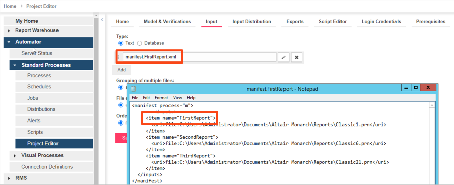 NOTE: The process name in the XML file (“m” in the example above) should be the same as the name of the Standard Process created.