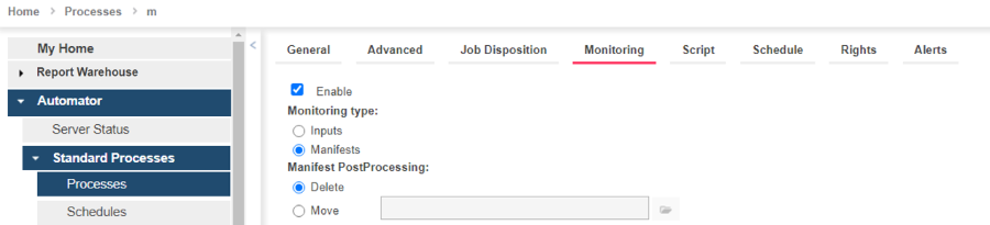 In the Monitoring tab, click the Enable check box, and select Manifests under Monitoring Type