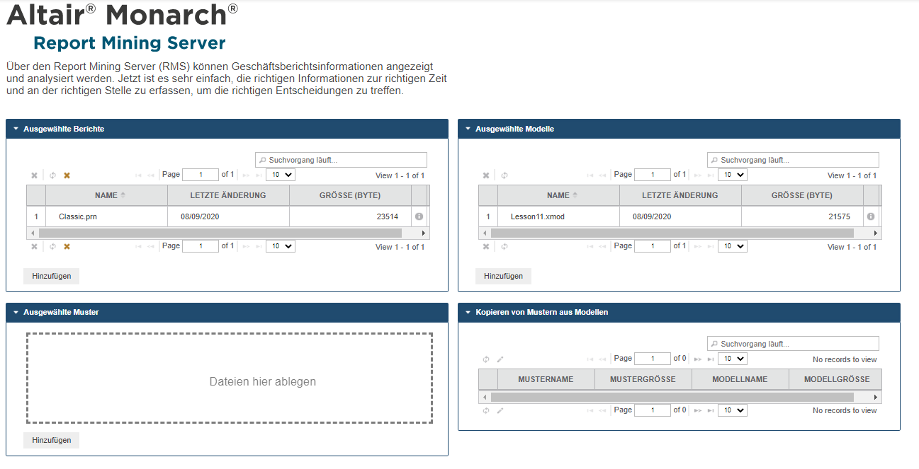 Ausgewählte Modelle: Zeigt die Liste der während der Anmeldung ausgewählten Modelle und Vorlagenmodelle an und auch die Modelle, die unter der Dokumententyp-ID gespeichert wurden.