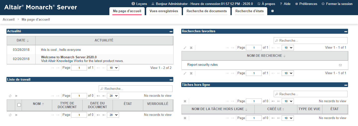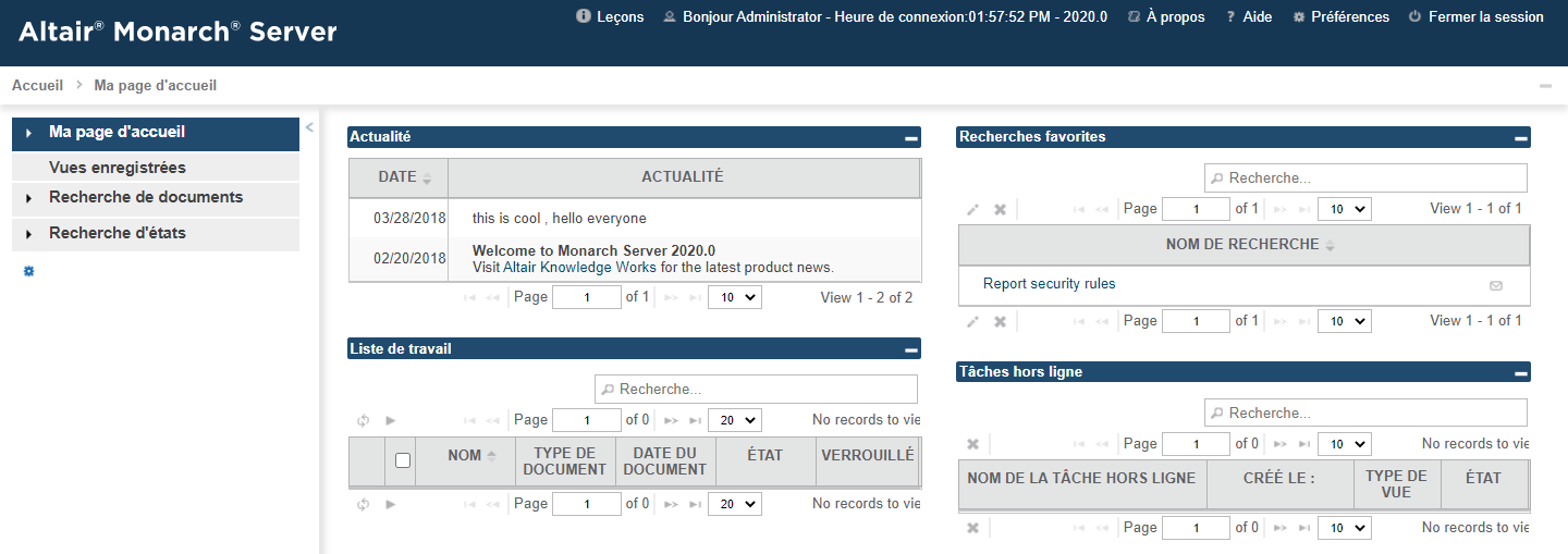 • Arborescence - Ce style divise l'interface MSClient verticalement, en deux moitiés ou volets. Le volet de gauche affiche l'arborescence, dont les liens donnent accès aux différentes sections de l'application, tandis que le volet de droite affiche la page de la section sélectionnée.