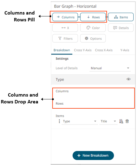 · drag text fields from the Data Table pane to the Columns or Rows pill or on the drop area under the Breakdown tab