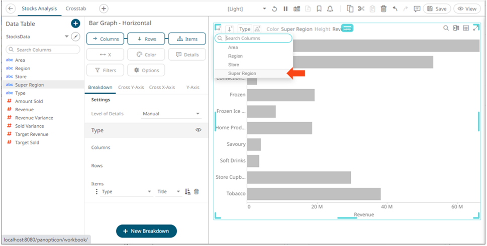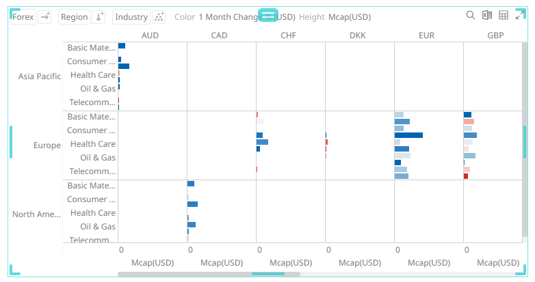 Once dropped or selected, the visualization will be cross tabbed, producing a series of smaller visualizations for each item within the column dropped.