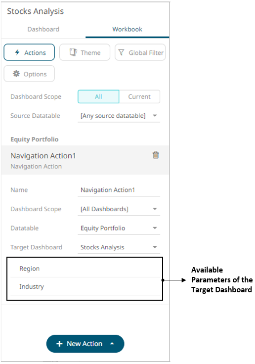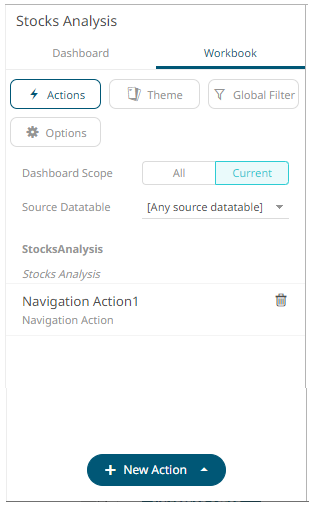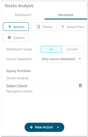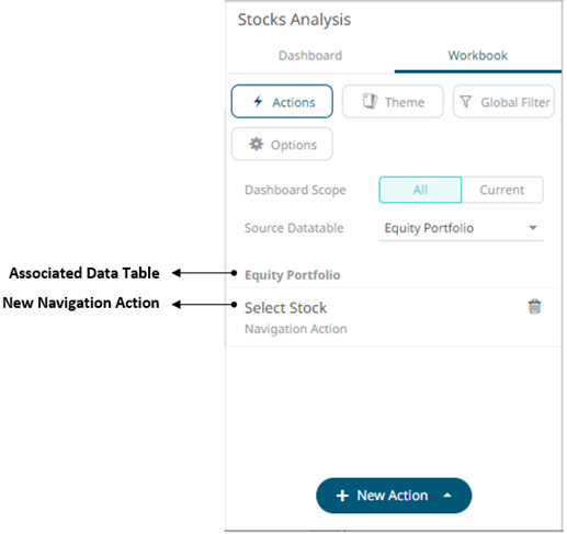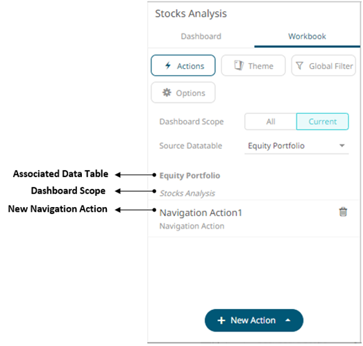 The new navigation action is added under the selected Dashboard Scope in the Actions list. For example, if Current is the selected dashboard scope and the source data table is Equity Portfolio, then it will be displayed as: