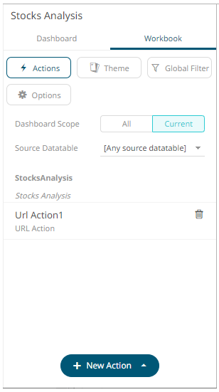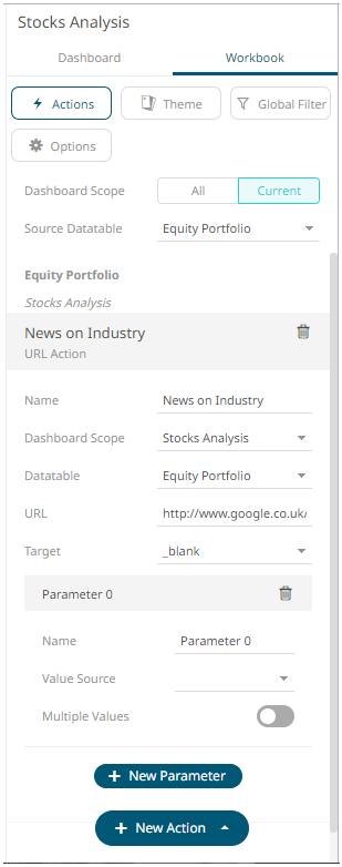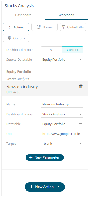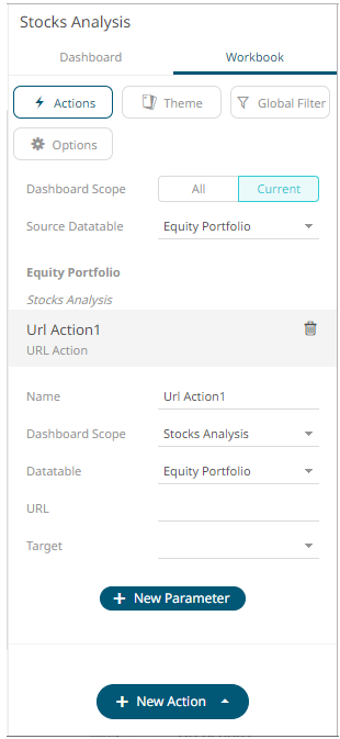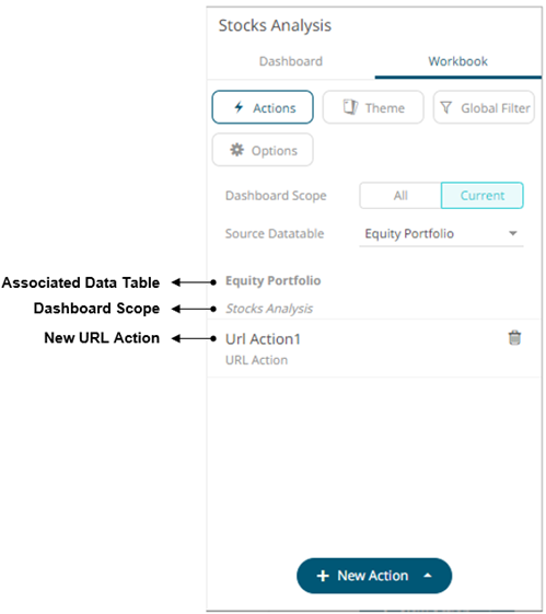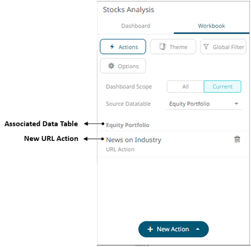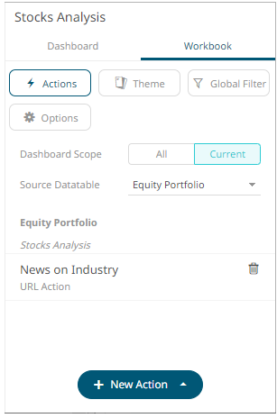 The new URL action is added under the selected Dashboard Scope in the Actions list. For example, if Current is the selected dashboard scope and the source data table is Equity Portfolio, then it will be displayed as: