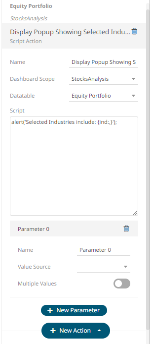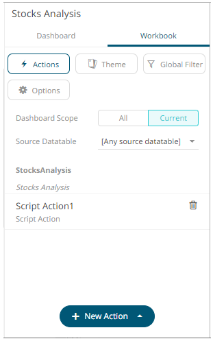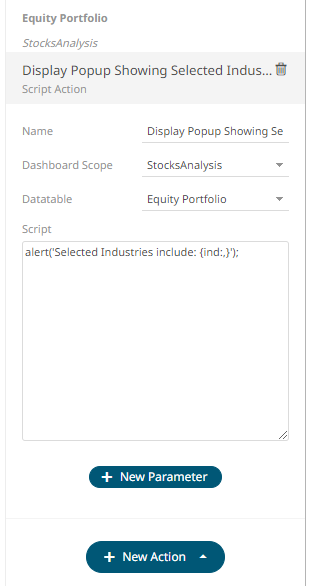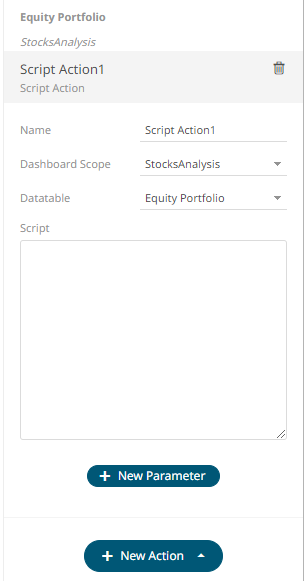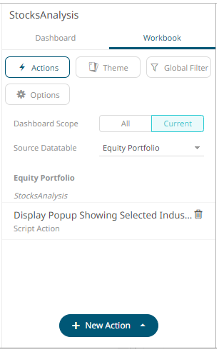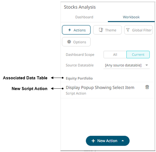 The new script action is added under the selected Dashboard Scope in the Actions list. For example, if Current is the selected dashboard scope and the source data table is Equity Portfolio, then it will be displayed as: