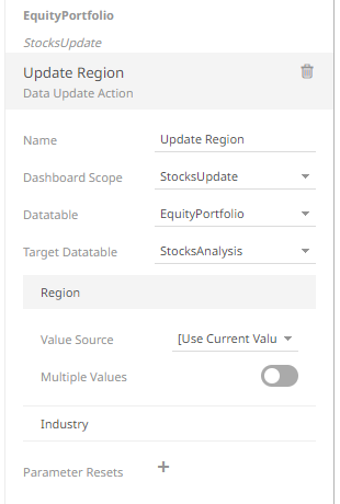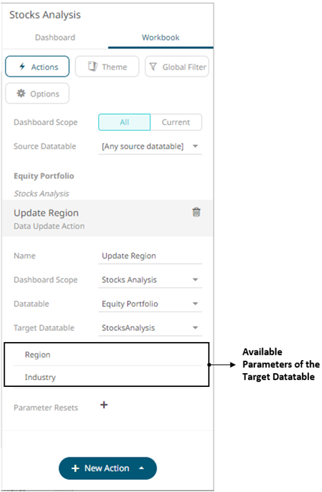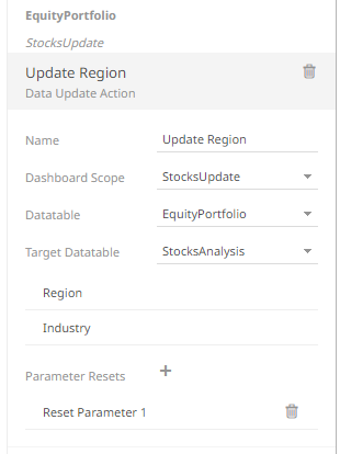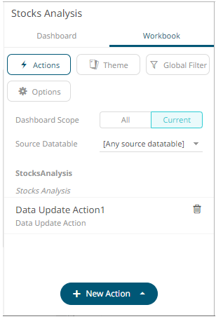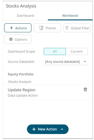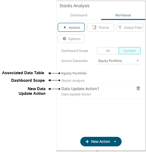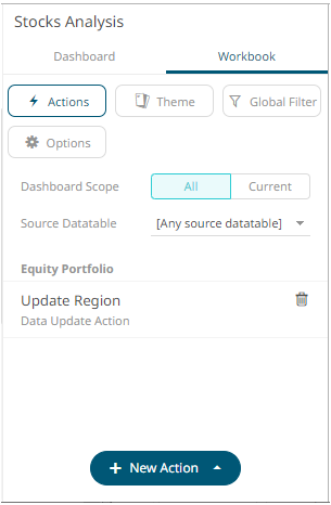The new data update action is added under the selected Dashboard Scope in the Actions list. For example, if Current is the selected dashboard scope and the source data table is Equity Portfolio, then it will be displayed as: