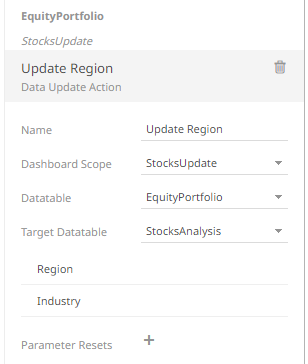 However, if no source data table is selected, then the first one in the Data Table pane (i.e., StocksAnalysis) is the default associated to the new data update action.