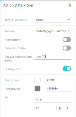 · tap the Default to Today slider to turn it on. This allows the action date picker to check the current value of the dashboard parameter. If it is set to null/empty, an action is executed to update the parameter and trigger the loading of the parameterized data with the current date.