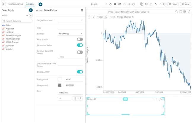 The Action Date Picker pane is displayed, and the Action Date Picker part is added on the dashboard canvas with the current date and the Set button to the right.