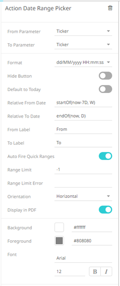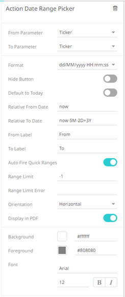 The Action Date Range Picker allows setting a date range (From Date and To Date) and triggering an action.