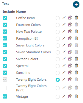 When a text column is added to the Color variable, the configuration pane displays the color associated with each categorical item, as specified with a default color palette (e.g., Twenty Eight Colors).