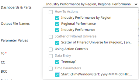 · Select dashboards or parts where to source the CSV data from, by checking their corresponding boxes in the Dashboards & Parts drop-down list.