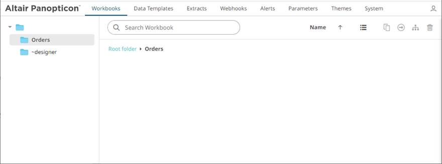 Users that log on with a Designer role will have their own personal folder created and displayed on the Workbooks page (e.g., ~designer). The personal folders: · are displayed and can be accessed for users with an Administrator or Designer role · are where Designers can create workbooks and build dashboards. For more information, refer to Altair Panopticon Web Authoring Guide on how to create workbooks on the Web client.