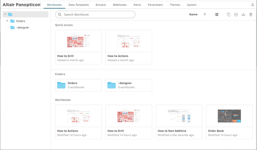 q The Workbooks include their titles, thumbnail images, and when they were last modified.