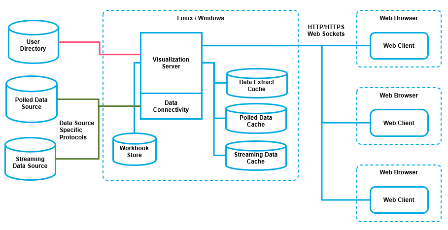 Panopticon Real Time is deployed and hosted on an internal network. The server can be accessed from internally and/or externally from the internet. Upon allowing access to the server from the internet it is recommended to have a proxy and firewall in front of the server.