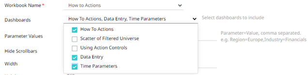· Select the Workbook Name in the drop-down list. These are the published workbooks available in the Workbooks page.