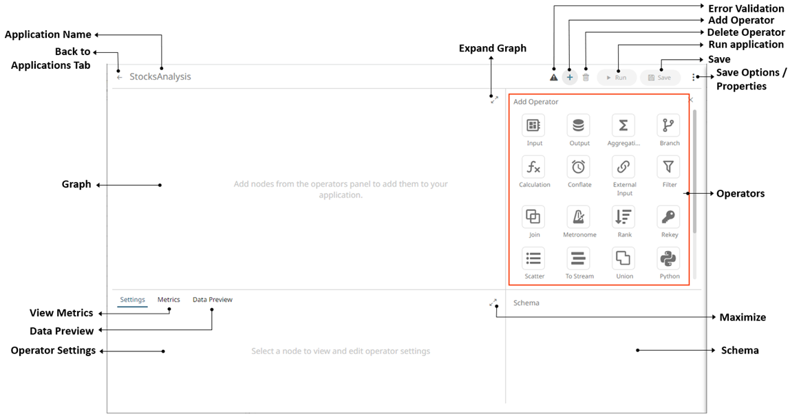 When an operator has been added or a node is selected in the application graph, the corresponding operator settings are displayed in the Operator Settings panel to allow editing.