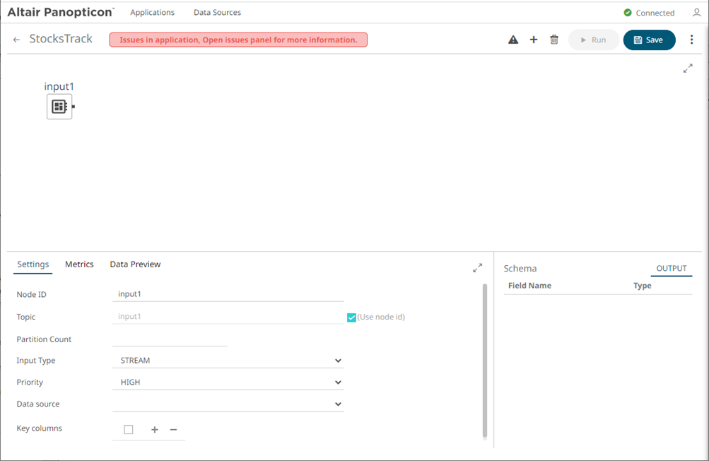 Panopticon Streams provides an error validation to help fix application issues.