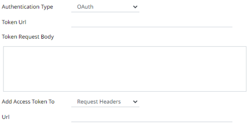 Then enter the following settings: o Token URL – The URL to retrieve the access token from. o Token Request Body – The request body used for access token requests. o Add Access Token To - The Access token retrieved from the Token URL can be added to headers, URL or request body, depending on how the endpoint needs the token.
