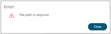 An error notification displays upon fetching sheets/column generation when the File Path is blank. Click Close and enter the file path. |
